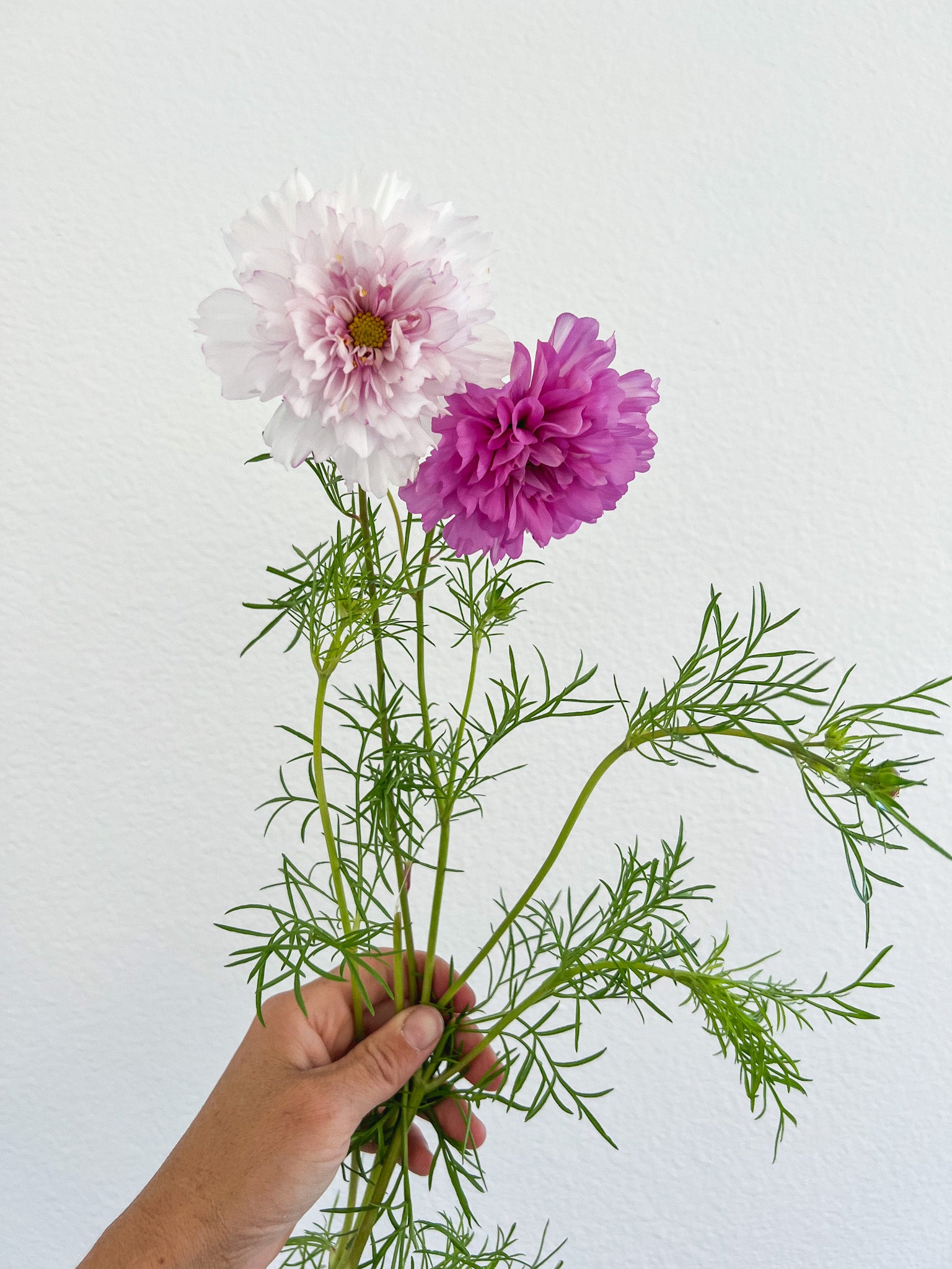 Cosmos are easy to grow and perfect for beginners. They're super productive and the more you cut them, the more they bloom, adding an airy and delicate element to your garden and bouquets. The long stems of this unique variety are smothered in double, ruffled blooms in shades of pink and white.