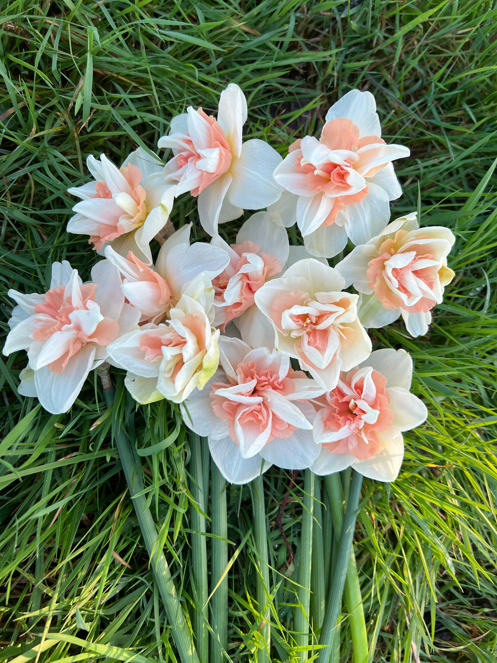 A double daffodil with petals that start white and blush and fade to pale apricot.