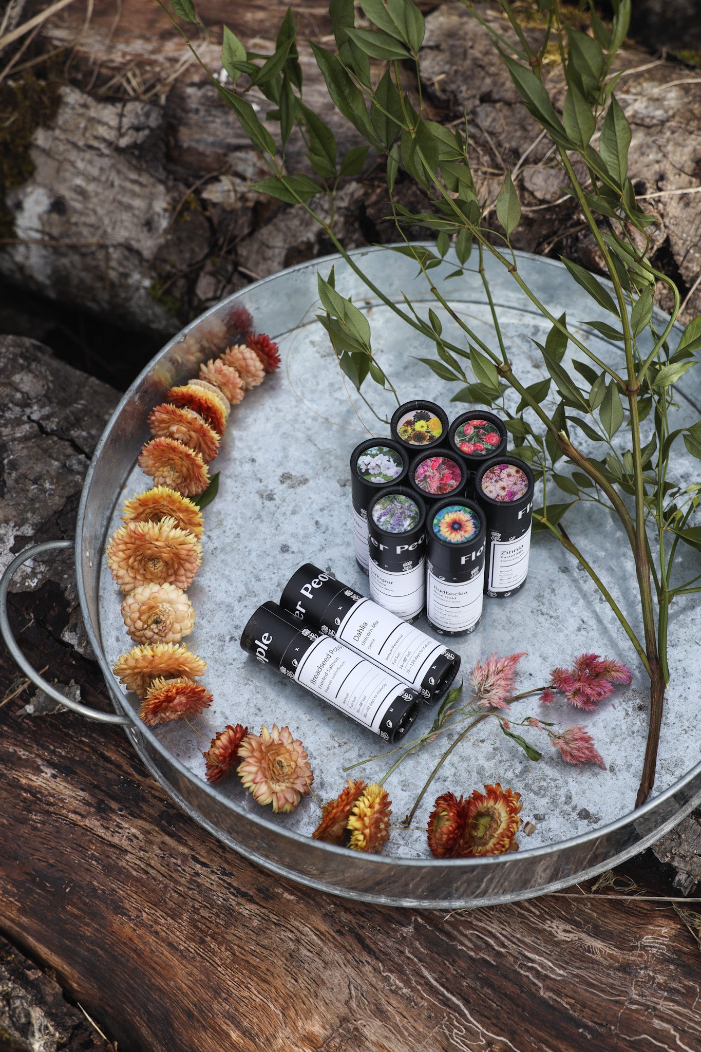 This collection includes Pastel Zinnias, Coral Celosia, Frosted Salmon Poppies, Earl Gray Larkspur, Apricot Peach Strawflower, and Rose Gold Rudbeckia. Each one was a standout in the garden, whether for its color, texture, or how well it held up in bouquets.