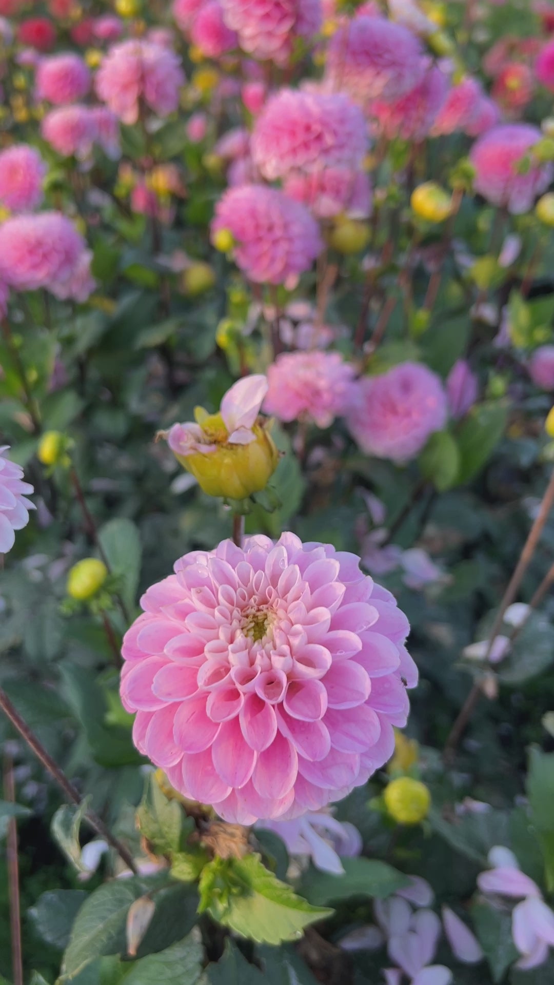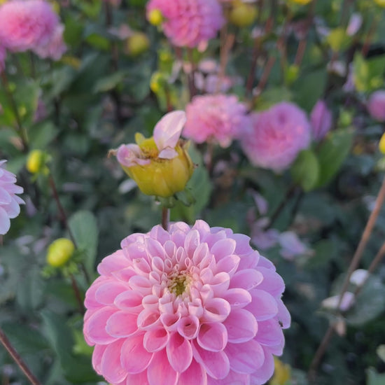 This soft, cotton candy pink, ball-shaped dahlia looks wonderful both in the garden and the vase. The sweet, knee-high plants are covered in pastel flowers all season long. This particular variety has a tendency to drop its petals once flowers reach full maturity, so harvest when blooms are still young, about one-third of the way open.